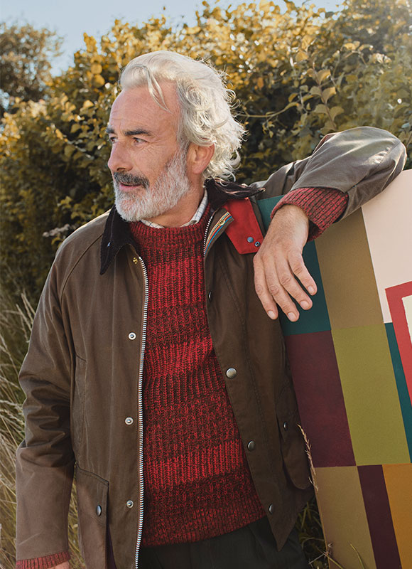 Paul Smith and Barbour share a lot of common ground, from their unwavering focus on quality and timeless design to their innate understanding of the qualities of British style. But, while Barbour is inseparable from the British countryside, Paul Smith has always been decidedly metropolitan. Now, town and country meet to create a collection packed with the distinct wit and character of both brands. Iconic Barbour jackets combine with Paul Smith’s Signature Stripe trims, unexpected colour-pops and patchwork finishes. In clothing, playful country motifs of a Freisian cow appear alongside mismatched Barbour family tartans and knitwear striped with speckled yarn for warmth with personality.